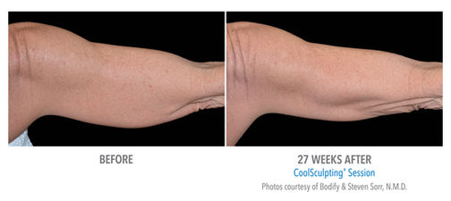 The CoolSculpting® procedure is FDA-cleared for the treatment of visible fat bulges in the submental (under the chin) and submandibular (under the jawline) areas, thigh, abdomen and flank, along with bra fat, back fat, underneath the buttocks (also known as banana roll) and upper arm. It is also FDA-cleared to affect the appearance of lax tissue with submental area treatments. The CoolSculpting® procedure is not a treatment for weight loss.